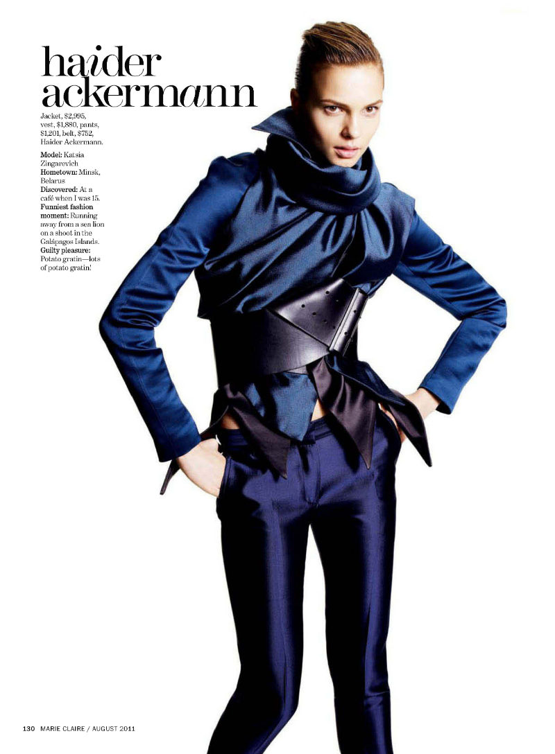 The Rise of Fall – Taking a look at the fall collections, Marie Claire US enlists Tesh for a story of strict glamour in its August issue starring Katsia Zingarevich. Wearing a mix of pantsuits and dresses from labels such as Louis Vuitton, Dolce & Gabbana and Emporio Armani styled by Laura Ferrara, Katsia delivers a lesson in posing with the high gloss studio images.