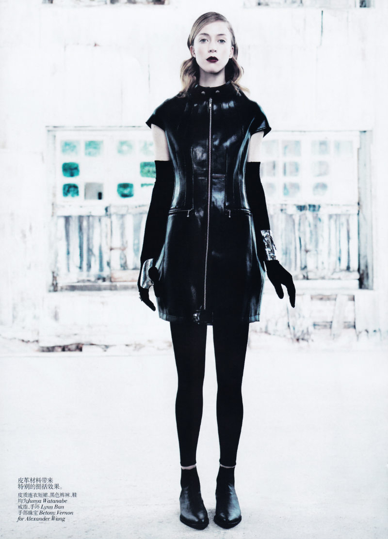 Cyber Mod – Taking 60s’ mod into a new decade, fashion editor Nicoletta Santoro pieces together a wardrobe of leather and black minis for Raquel Zimmermann in the August edition of Vogue China. Photographed by Willy Vanderperre, Raquel makes a stoic yet beautiful subject in the sleek designs of Lanvin, Prada, Marc Jacobs, Alexander Wang and many others.